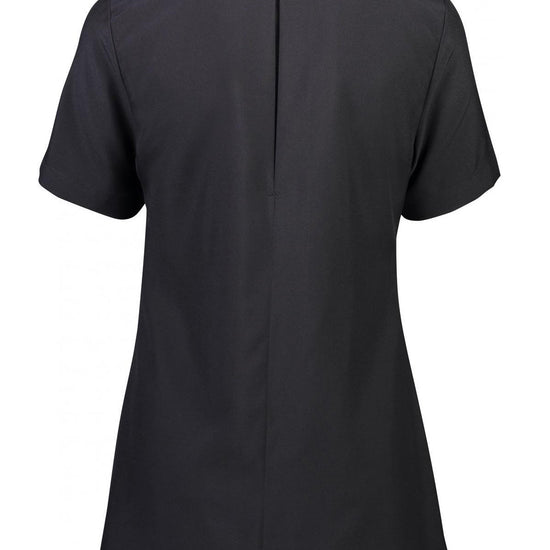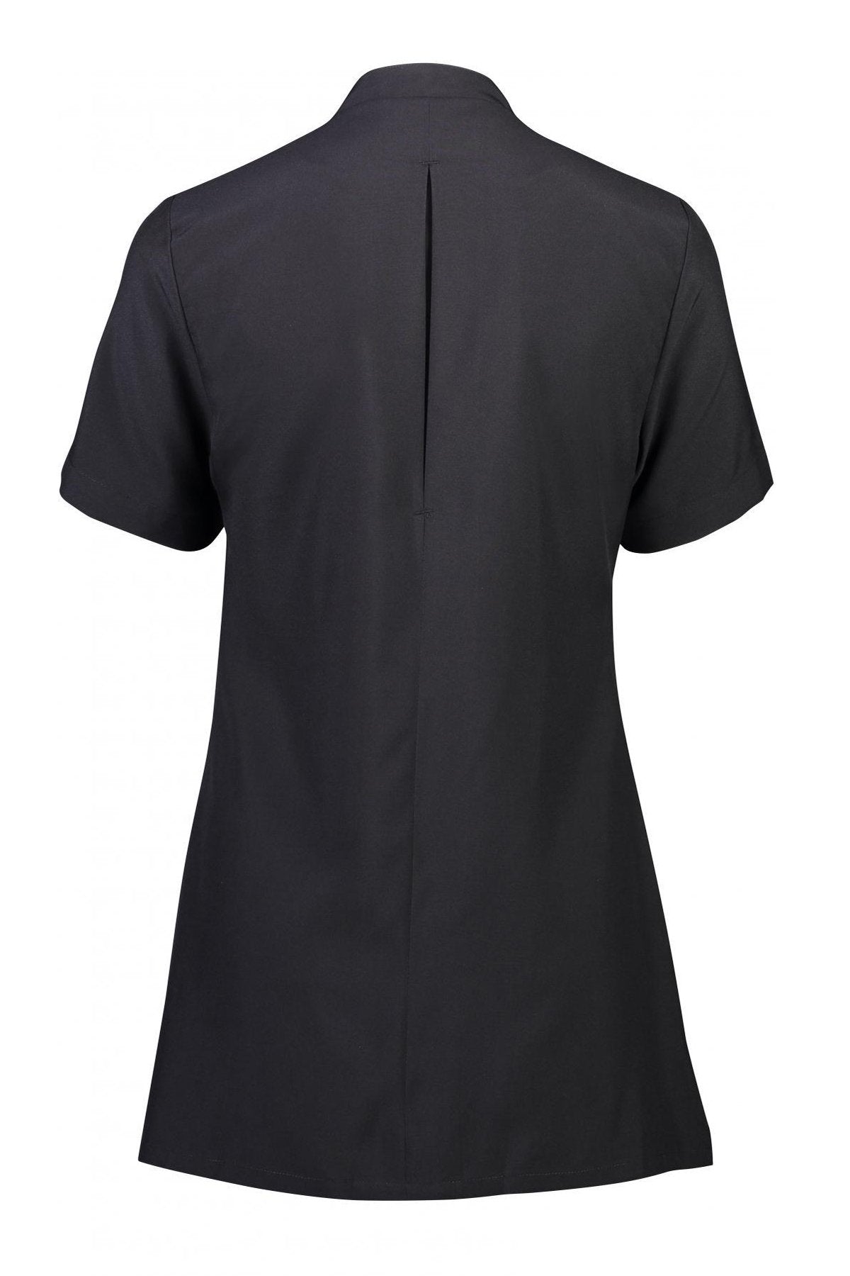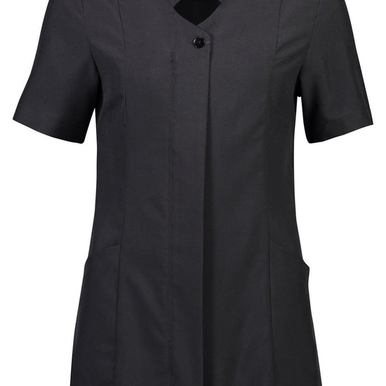 A sculpted neckline adds interest and sophistication to customer-facing teams in beauty and healthcare. Features include a concealed zip front with button closer, two deep hip pockets and action back for mobility.