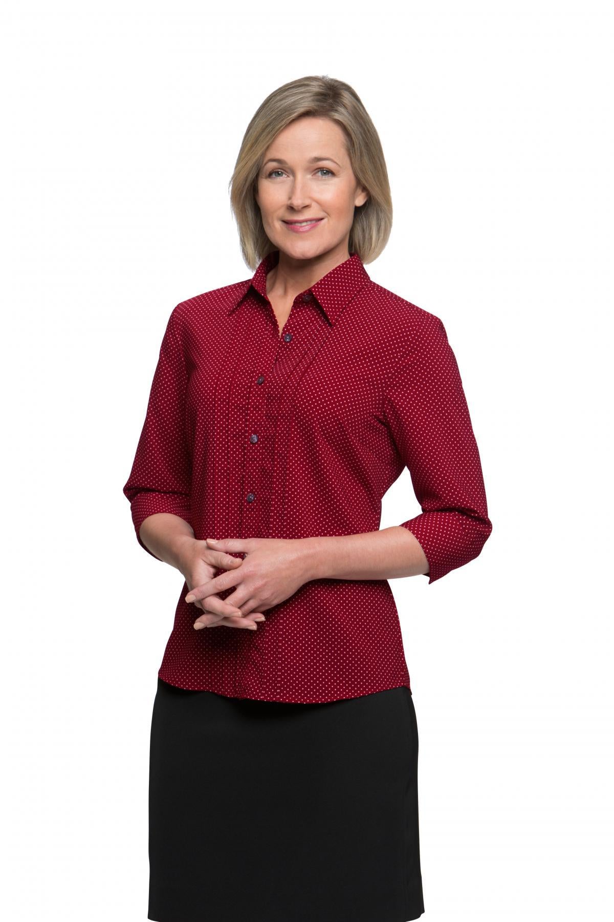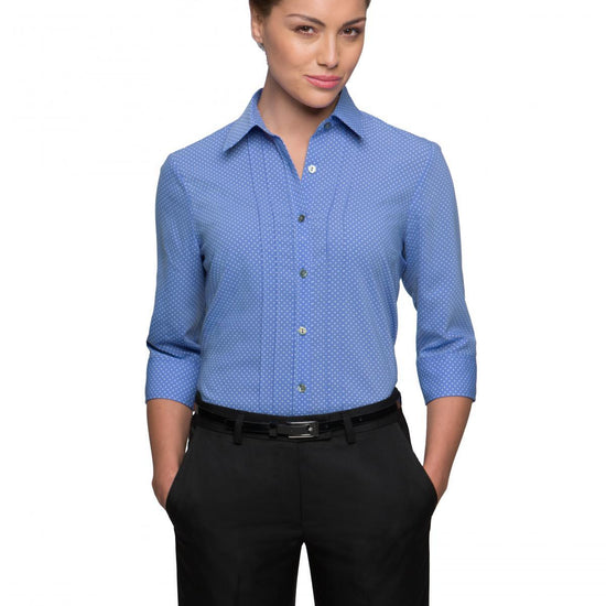 With delicate front pin tuck detailing and a fresh polka dot print, this blouse provides new interest to the functional blouse. This fabric has a natural stretch and two back vertical darts for movement. 3/4 sleeve with adjustable cuffs.