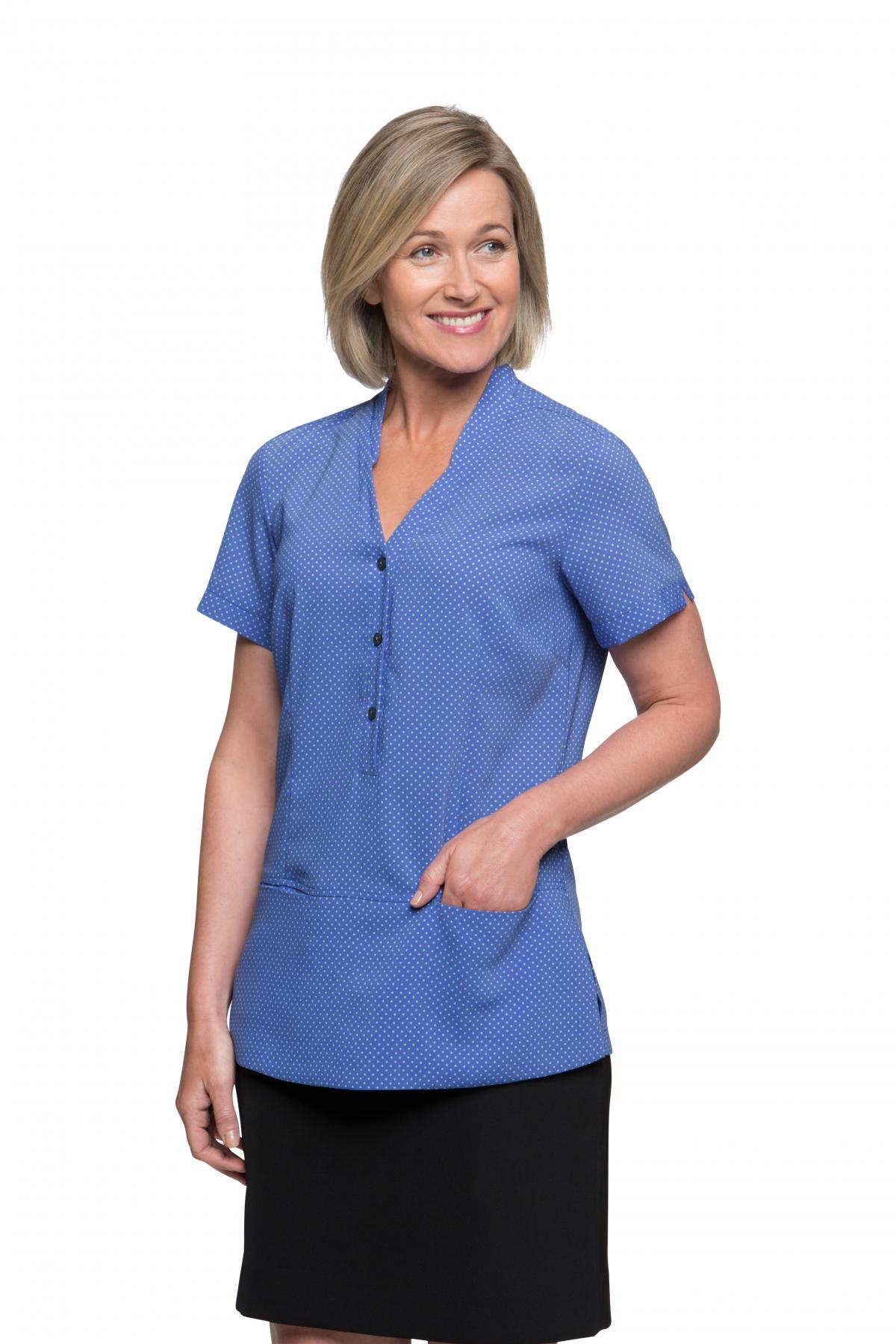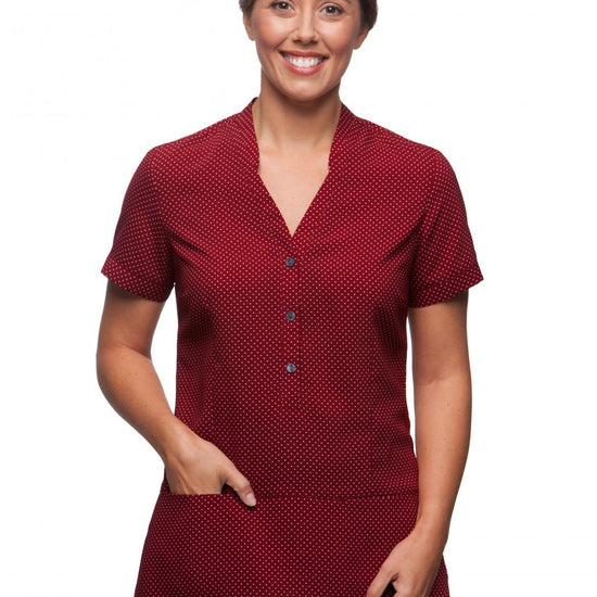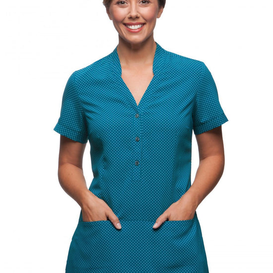 In a fun, friendly polka dot spot design, this tunic is a fresh twist on the classic tunic. With a two front pockets, a natural stretch and side splits, this piece is practical and comfortable.