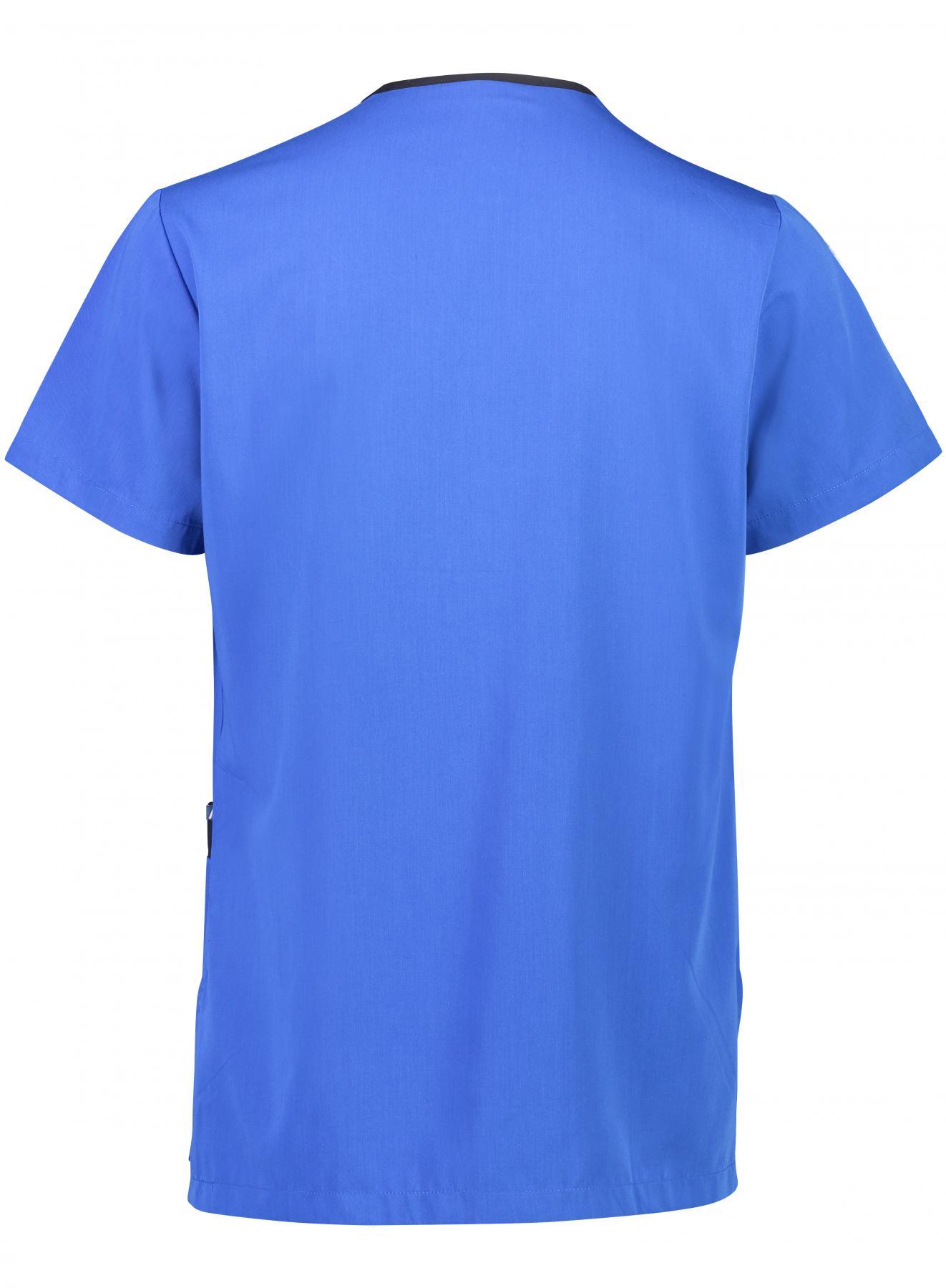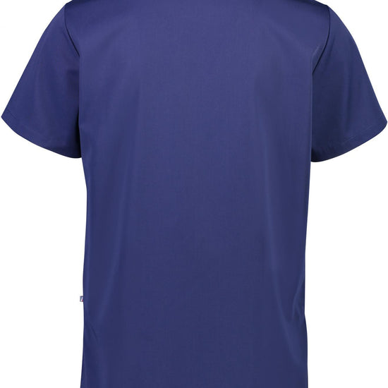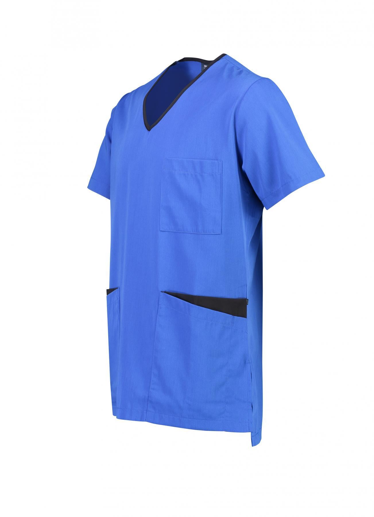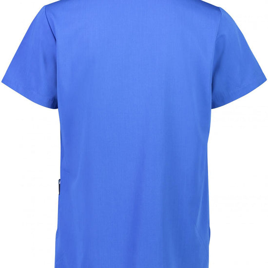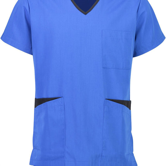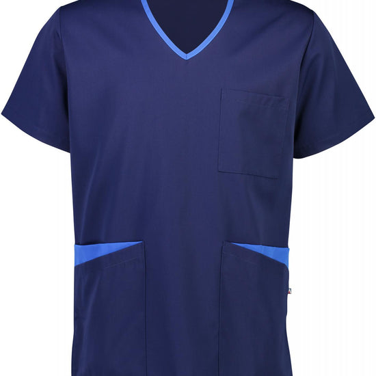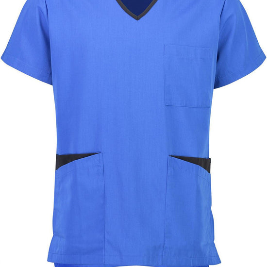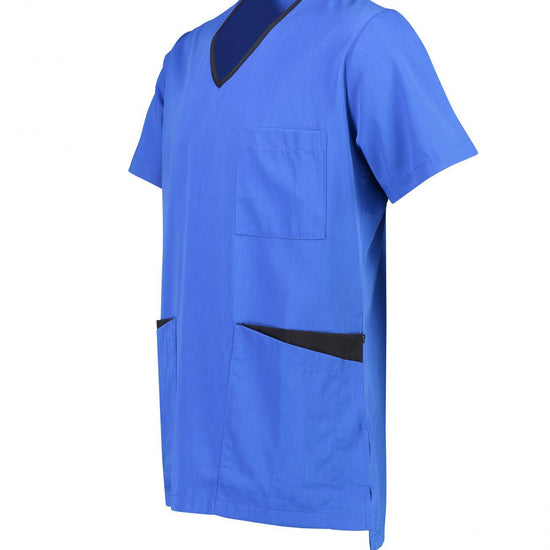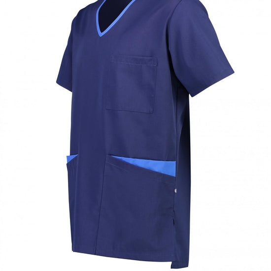 A V-neck design scrub with contrast detailing along neckline and pockets. This style has a chest pocket, two hip pockets with concealed contrast pockets and side seam splits to allow for ease of movement.