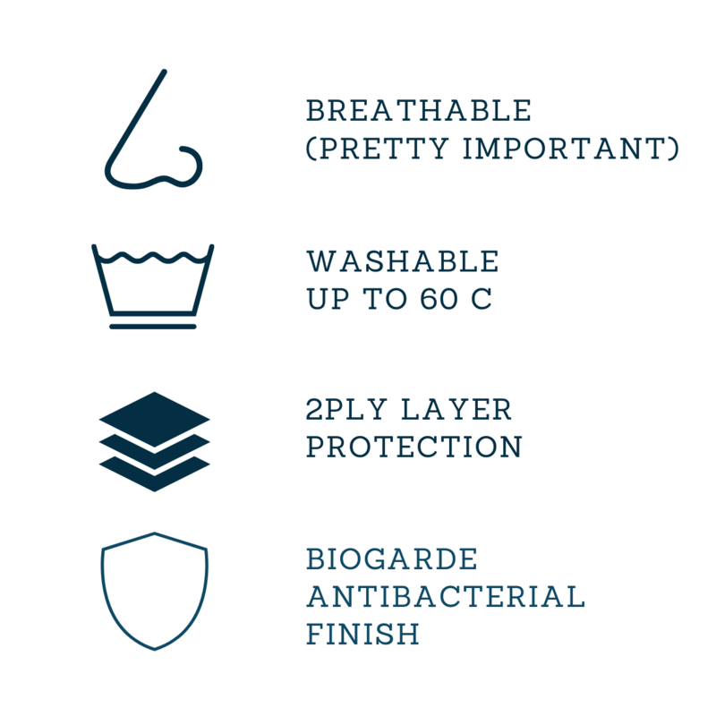 This face mask has been treated with BioGarde - a coating that destroys microbes that come into contact with the fabric. BioGarde is the perfect anti-bacterial protection for your face covering.