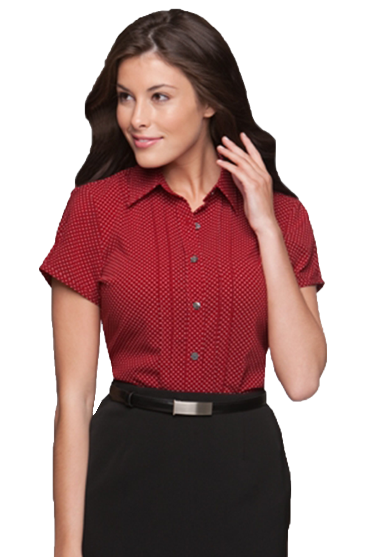 A beautifully tailored blouse, with back darts, a curved hem, and delicate pintuck detail. We love how easy this blouse is to care for, and the fresh polka dot spot print gives a twist on a classic blouse. A wonder button prevents gaping.