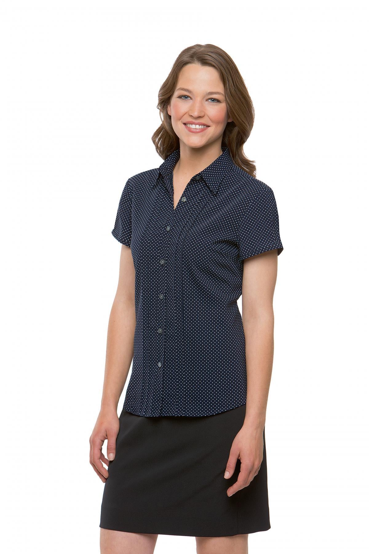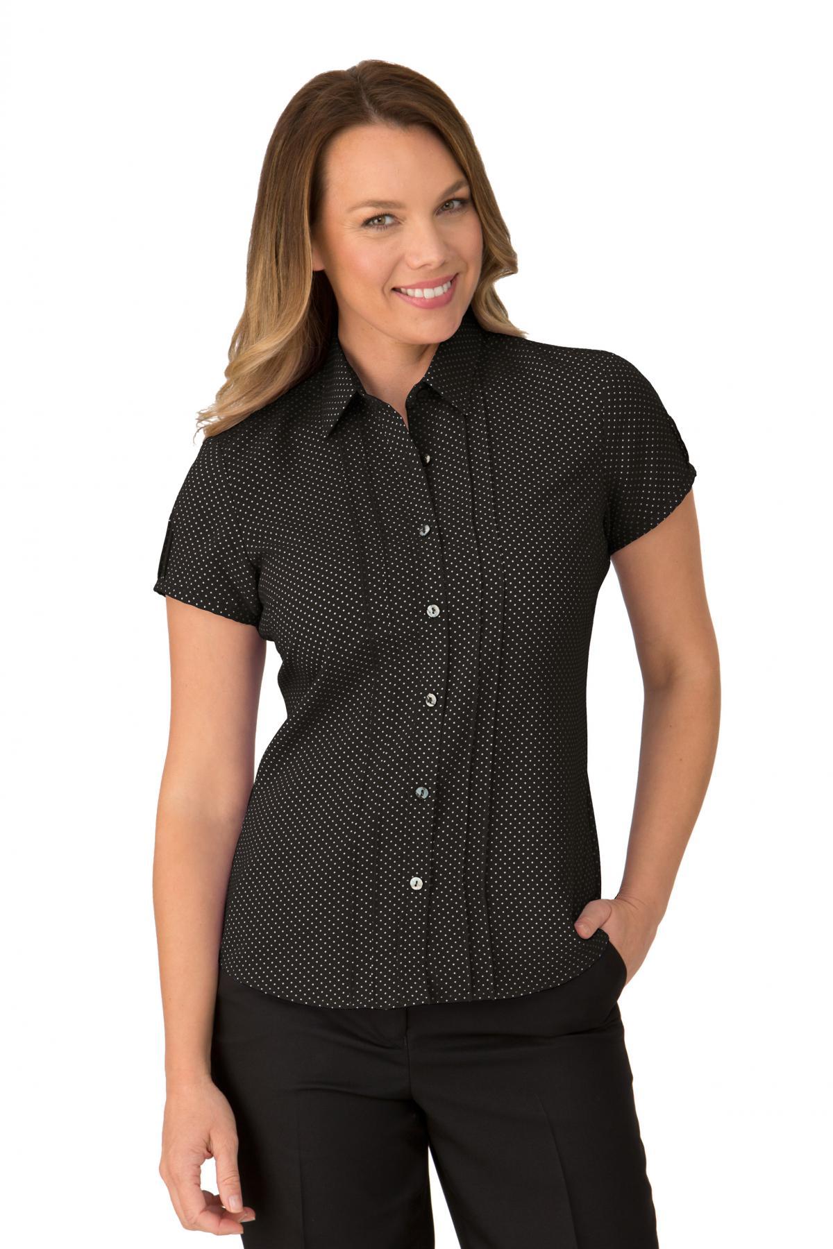 A beautifully tailored blouse, with back darts, a curved hem, and delicate pintuck detail. We love how easy this blouse is to care for, and the fresh polka dot spot print gives a twist on a classic blouse. A wonder button prevents gaping.